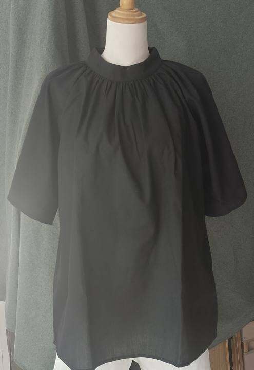 日单落肩半袖褶皱圆领宽松套头衬衫女