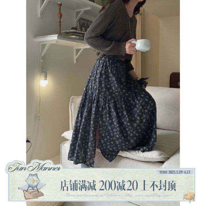 JMWOMEN复古碎花压褶高腰半身裙女2025春季宽松开衩设计a字长裙子