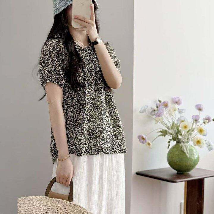 显瘦小碎花上衣!定染精纺薄软棉复古圆领短袖上衣女2025夏自制