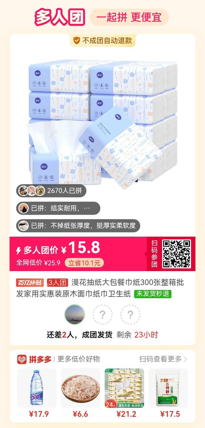拼多多差2个,纸巾。漫花抽纸