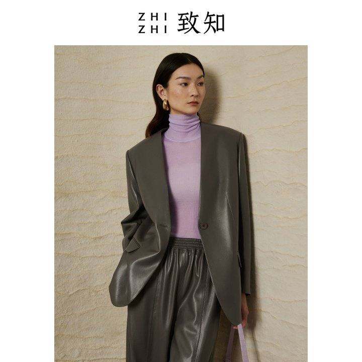 致知ZHIZHI 翁吟 黑色小西装外套女新款秋季时髦环保皮质无领