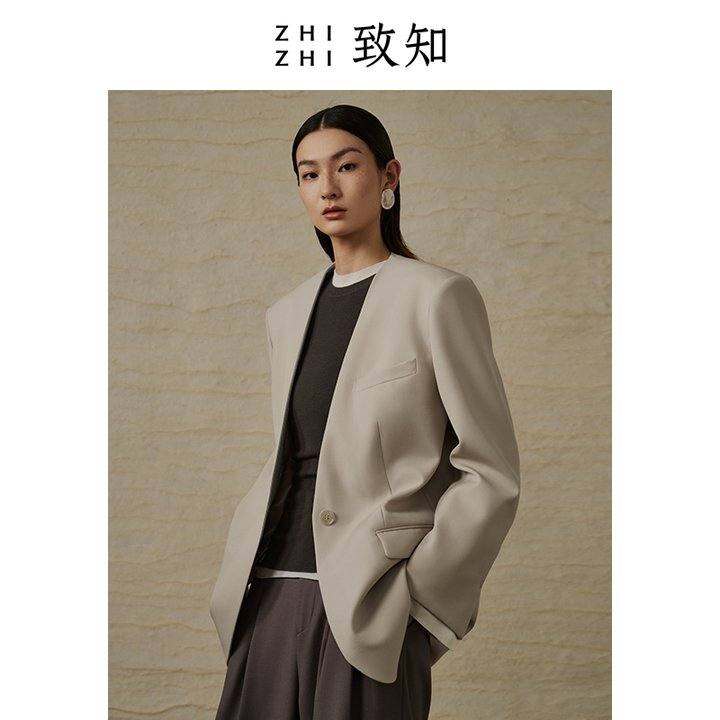 致知ZHIZHI 归自谣 西装外套女秋季新无领宽肩羊毛高级设计感