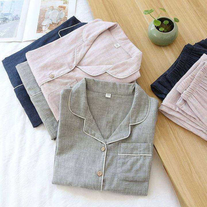 情侣睡衣春秋款纯棉纱布长袖女水洗棉薄无印风简约家居服男士套装