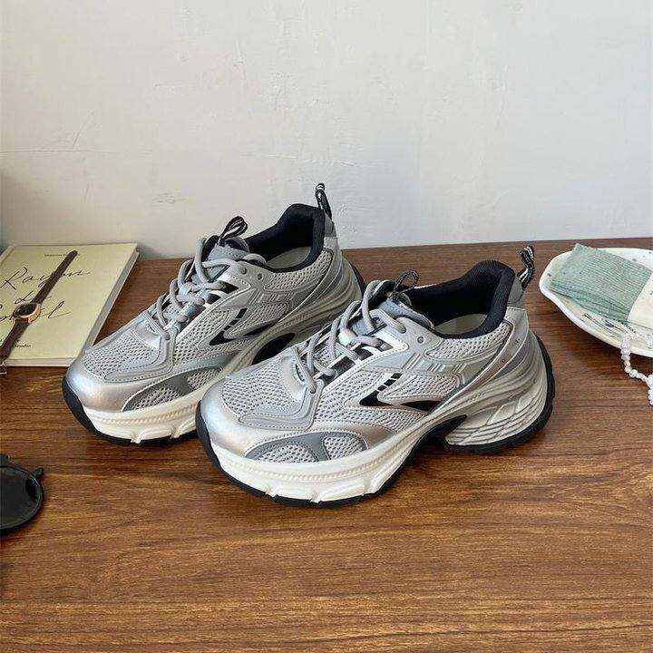 撤柜单~银色运动老爹鞋女2024新款厚底增高百搭复古休闲