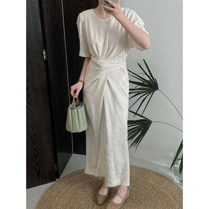 新中式绑带收腰连衣裙女夏2024新款设计感复古刺绣重工暗纹长裙子
