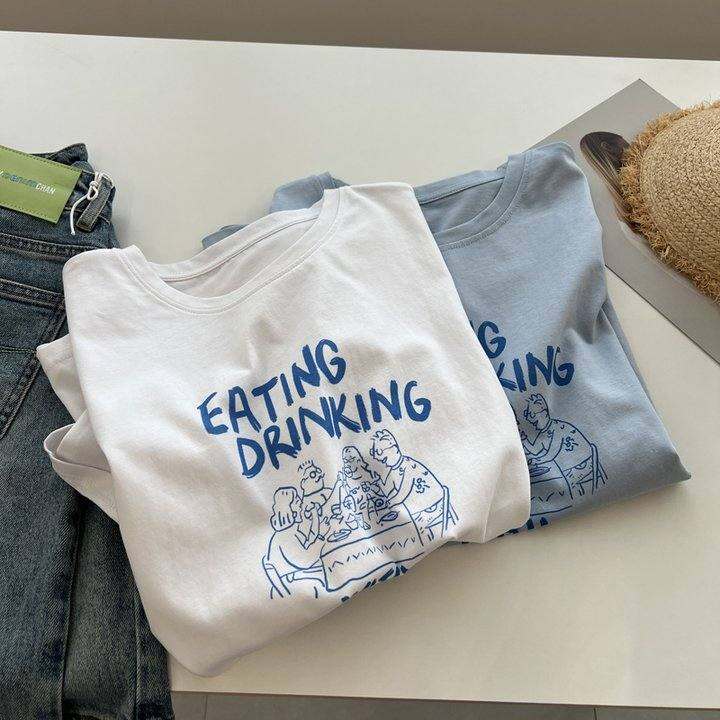 美式休闲简约印花圆领短袖t恤女宽松棉质新款夏季打底衫上衣学生