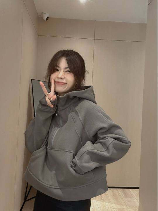 豆子噢 scuba游牧灰 lulu同款宽松半拉链加绒连帽卫衣休闲外套女