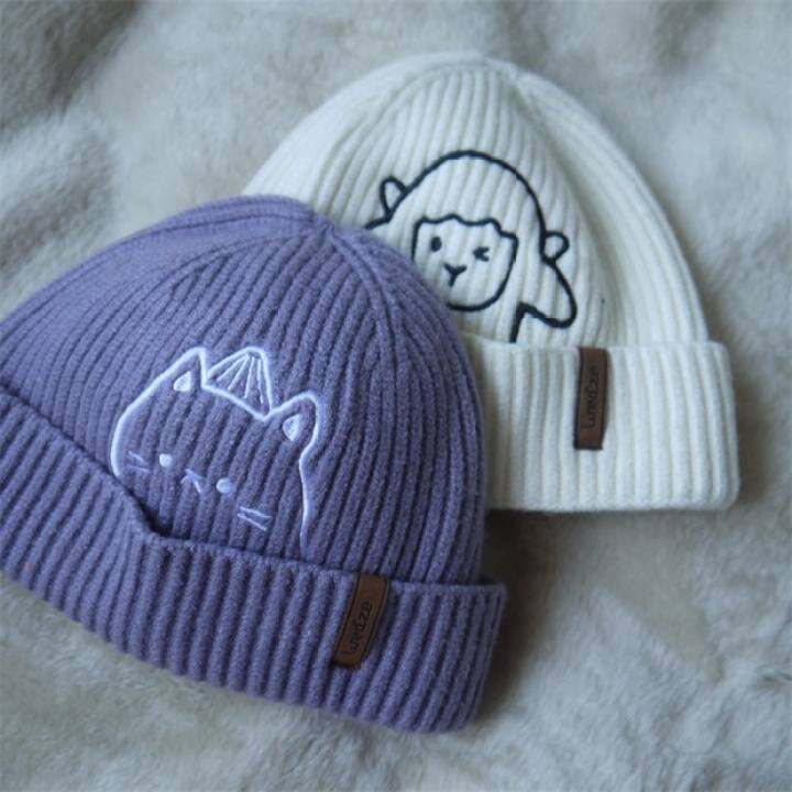 外贸大童女款针织毛线帽翻边刺绣卡通冷帽包头帽子休闲保暖护耳