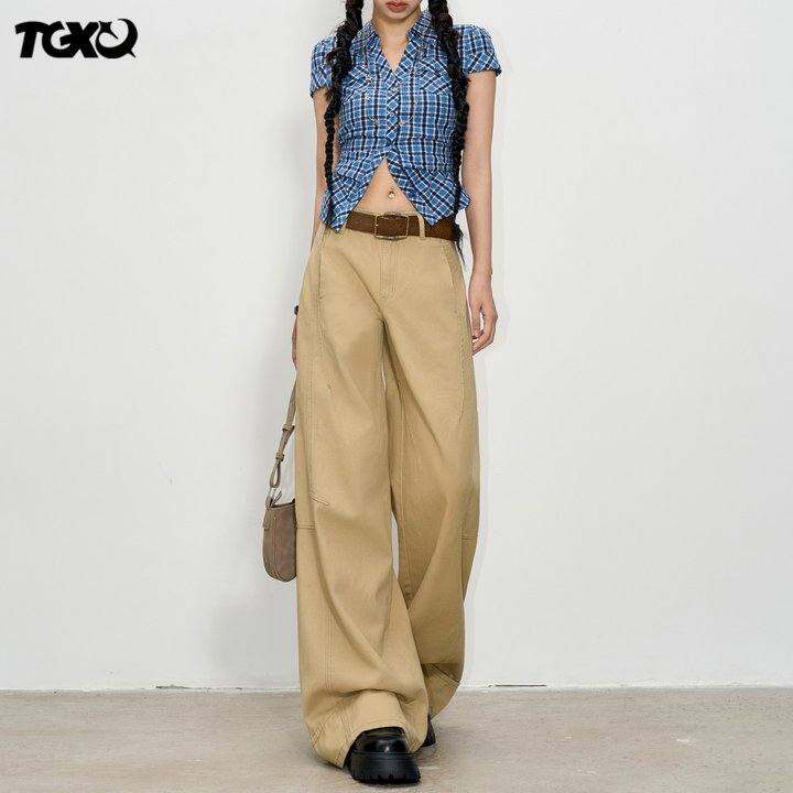 卡其色牛仔裤女2025年新款时尚潮流夏季高腰拼接宽松拖地阔腿裤子