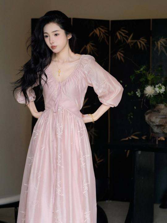 TYANG贰羊设计【竹意】国风新中式气质收腰粉色v领刺绣连衣裙女夏