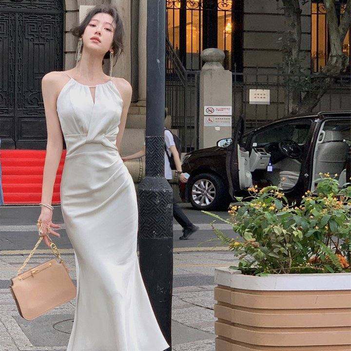 从一时刻【造物神】白色挂脖吊带连衣裙女夏缎面鱼尾高级感长裙子