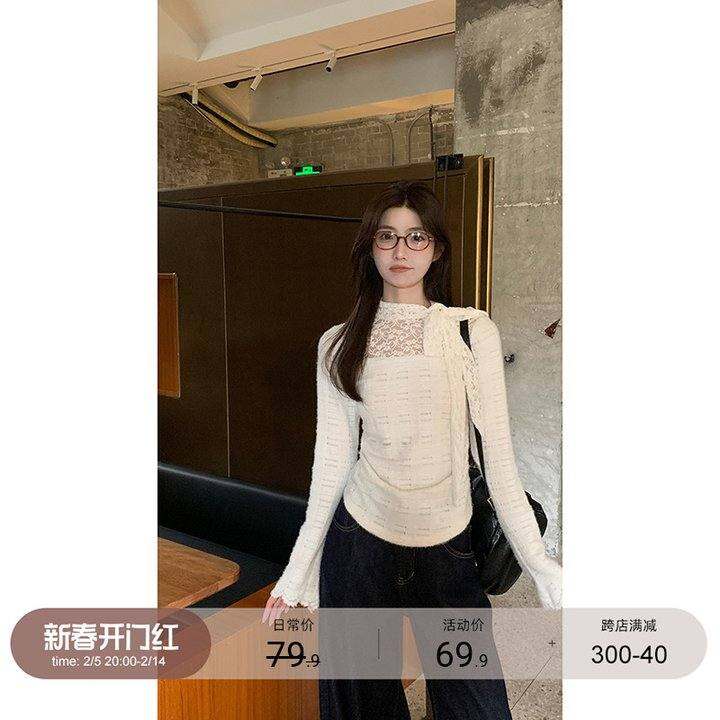 红人馆内搭打底衫女春季新款高级感蕾丝修身t恤长袖独特绝美上衣