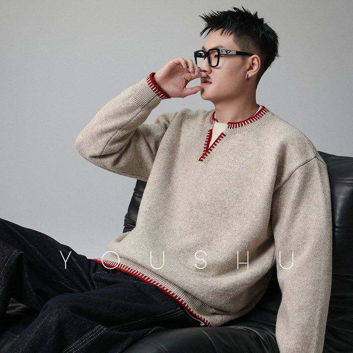有术羊毛混纺拼色V领毛衣男2025冬季新款长袖宽松假两件针织衫