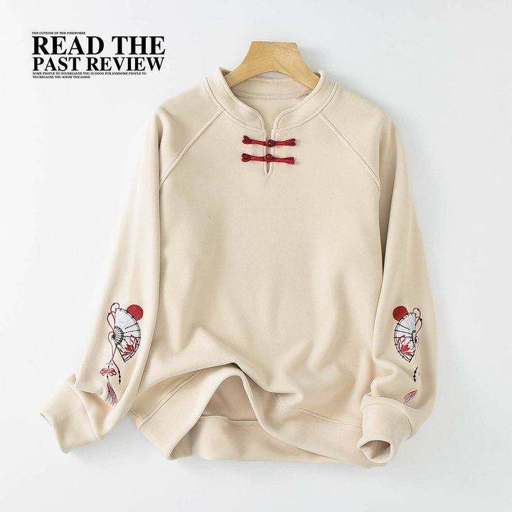 加绒加厚冬季宽松复古国风上衣立领盘扣纯色百搭刺绣卫衣女9619