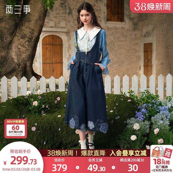 两三事小个子高腰背带裤女2025春新款阔腿牛仔裤宽松裤子蓝韵花境