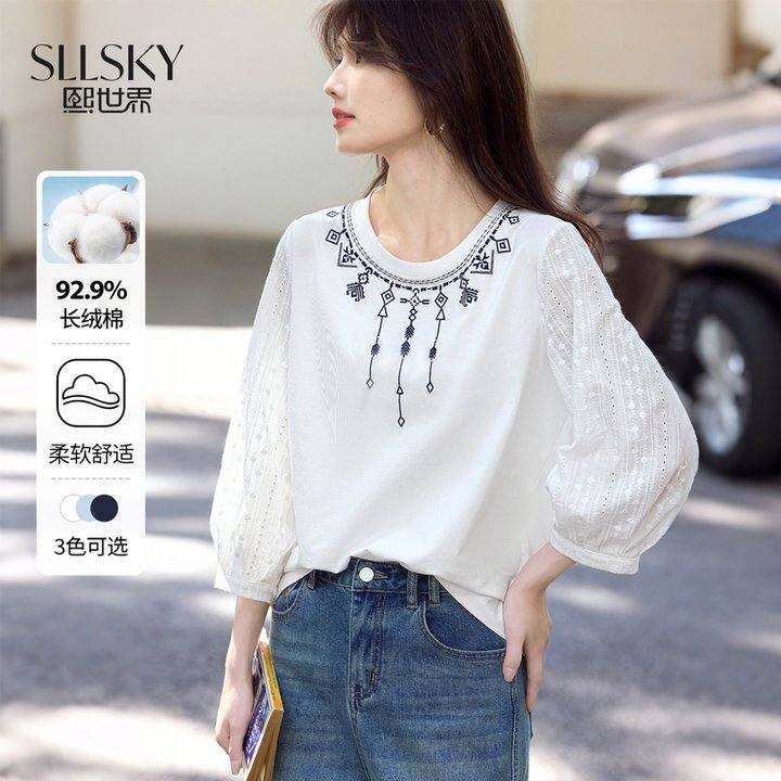 熙世界民族风刺绣圆领T恤女初秋2025年新款宽松慵懒风七分袖上衣
