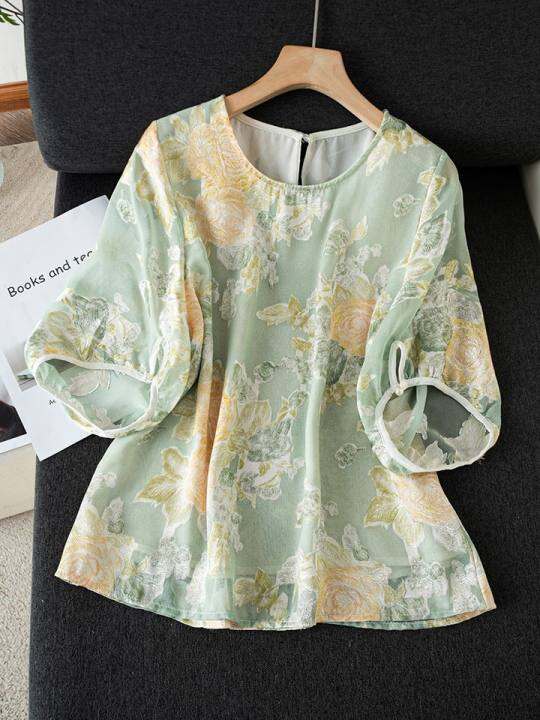 古风韵味 立体提花~丝滑轻薄透气亲肤圆领泡泡袖宽松衬衫夏C42123