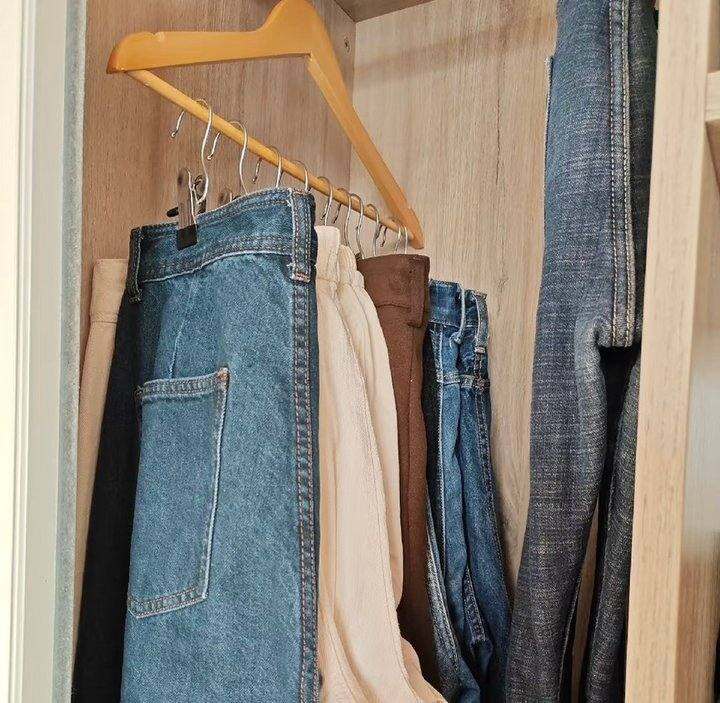 不会用的宝参考主图,是小地瓜上的收纳办法,1个普通衣架+N个裤夹,可以让1个挂衣位收纳多个裤子,而且方便拿取。