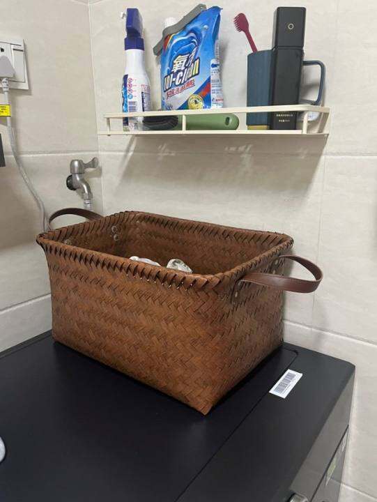 这个筐子真挺好用的,说是塑料编的,但是特别软,也没有毛刺,摸起来很平滑,才十几块钱,把手还是皮革的。之前买了一个装零食,现在又买了一个洗澡的时候放衣服,很满意!这价格真的没得说