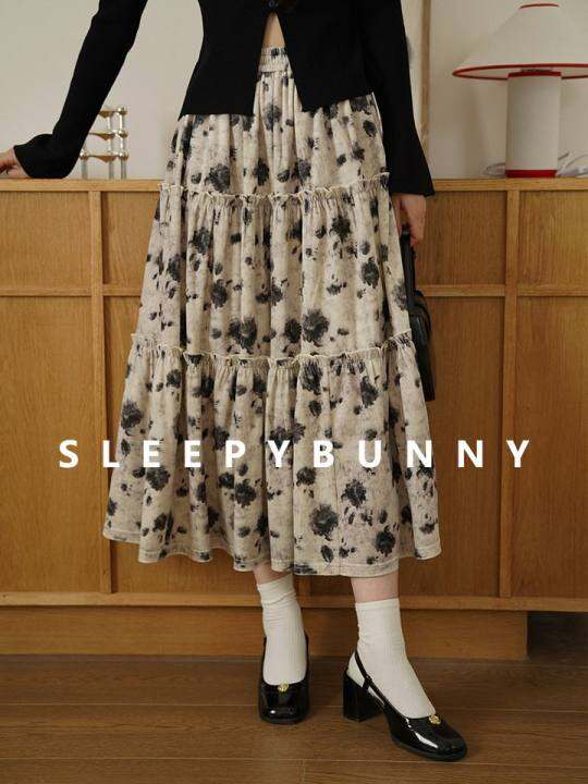 瞌睡兔 复古气质玫瑰印花丝绒半身裙女冬季木耳边显瘦中长裙子