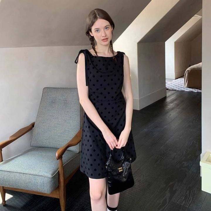 KERNEL COSMOS 黑莓可露丽 蝴蝶结系带一字领复古波点收腰小黑裙