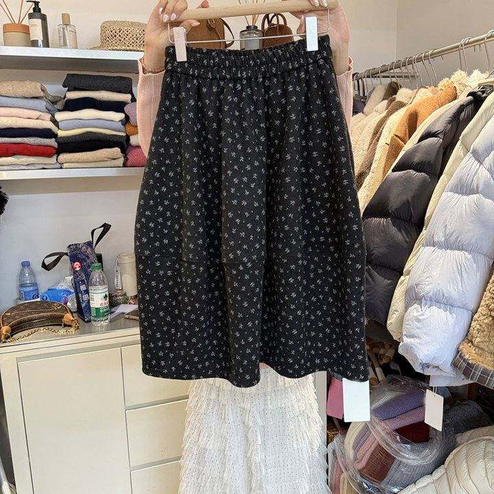 2025年冬季新款韩版宽松高腰橡筋设计通勤休闲百搭碎花毛呢半身裙