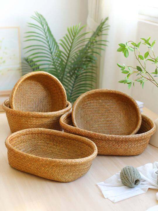 家好点桌面收纳篮手工草编杂物整理篮 家用零食面包水果收纳托盘