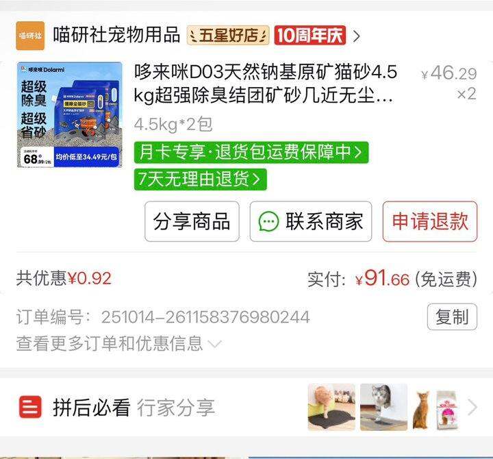 前两天刷到这个品牌的矿砂测评,三款都挺不错的,这款表现最好,家里猫砂快没了准备双十一买这个的,今天上pdd发现有个什么补贴,46块钱两袋,比桃的日常价便宜22,先买了四袋,双十一再看看桃的价格,比这个便宜就再多买几袋