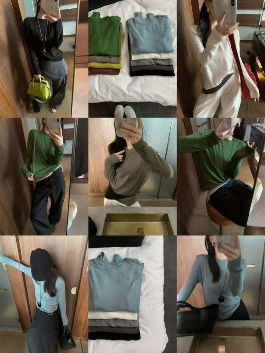 韩国2025秋款圆领长袖宽松百搭纯色天丝打底衫针织衫潮8619