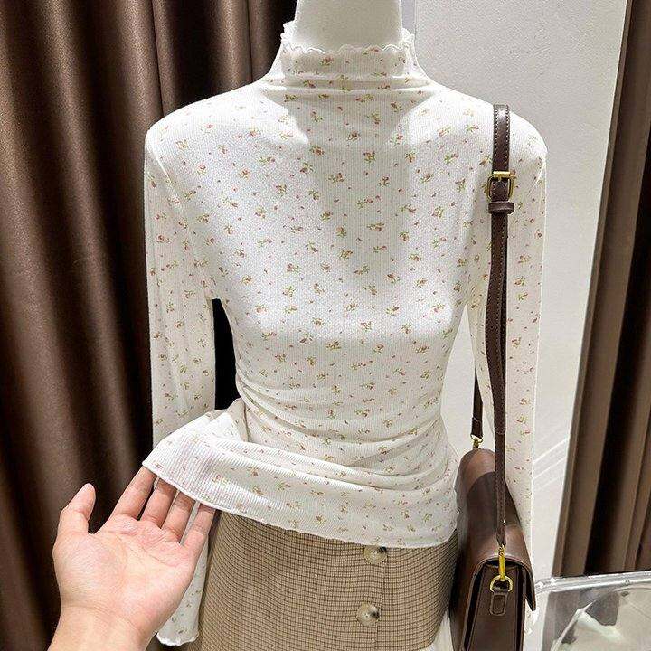 小碎花半高领打底衫女春秋内搭木耳边白色坑条针织薄款长袖上衣