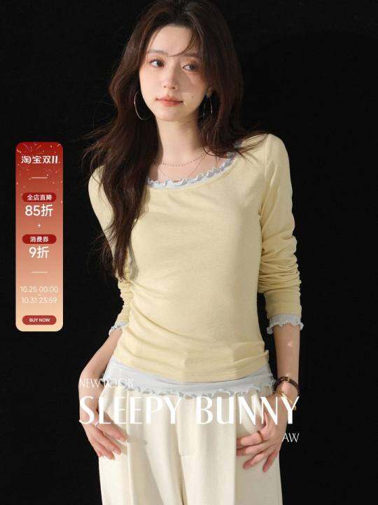 瞌睡兔 撞色假两件圆领长袖T恤打底衫女秋温季柔减龄正肩显瘦上衣