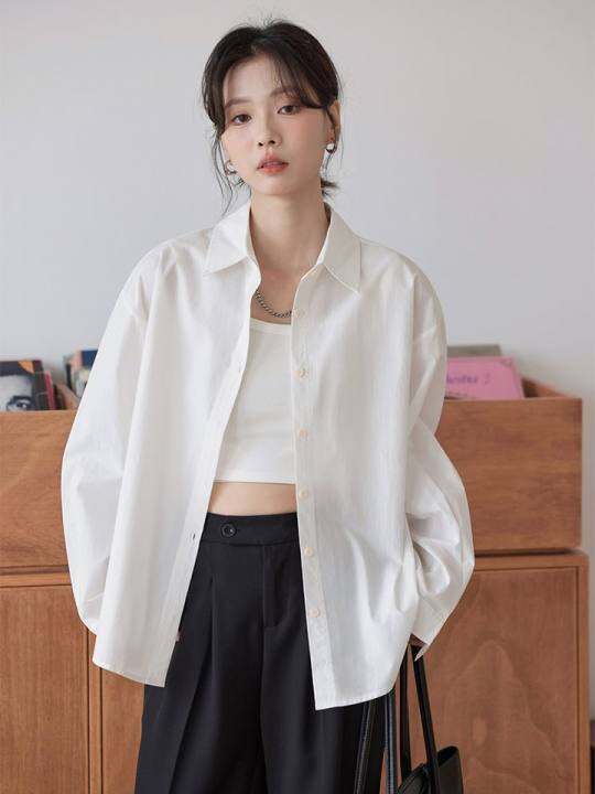 2024年春季新款纯棉白色衬衫女长袖春秋宽松纯色翻领全棉衬衣开衫