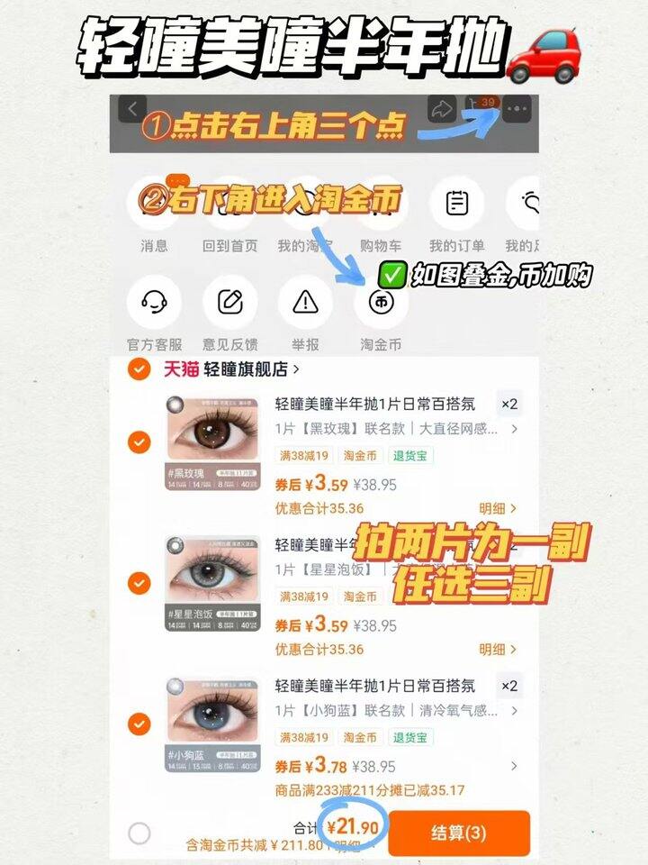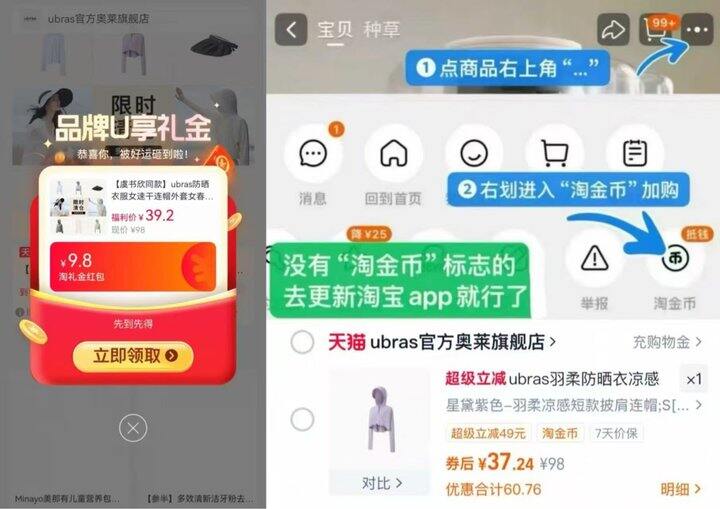 ③右上角[•••]淘金币加购1件