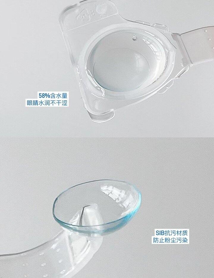 含水量是55%,镜片柔软,透氧性高!不滑片不刺眼,弧度也与眼球的贴合度很好!!还抗UV!!