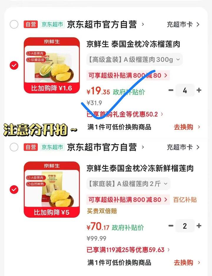京鲜生泰国金枕头冷冻榴莲肉