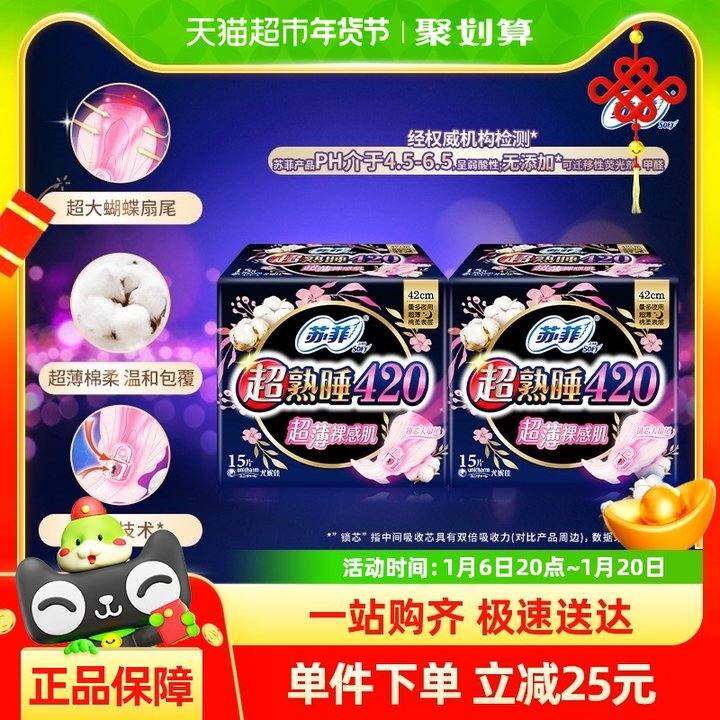 苏菲卫生巾超熟睡超薄裸感肌棉柔夜用姨妈巾420mm*15片*2包