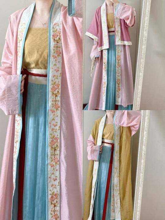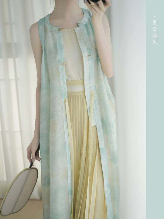 闲时雨夏日海风天丝提花印花长比甲对襟长衫圆领半袖日常汉服女夏
