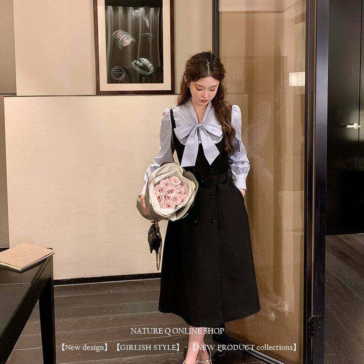 杨小卷千金学院风假两件蝴蝶结黑色连衣裙女蓝条纹长袖撞色衬衫裙