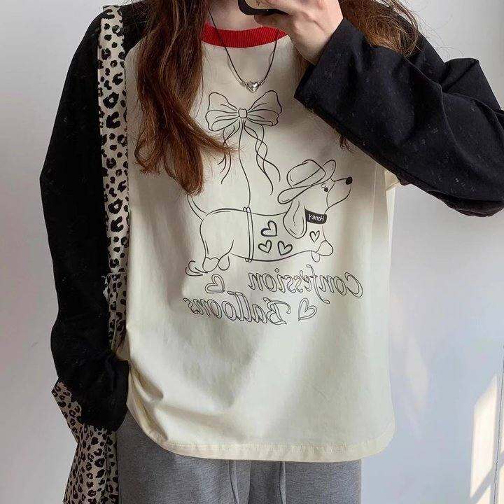 Undefined 红色撞色领可爱腊肠狗插肩袖宽松T