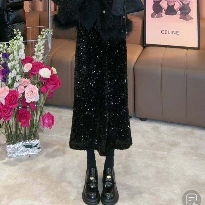 丝绒亮片半身裙女2024秋冬气质韩版穿搭复古风百搭显瘦长短款半裙