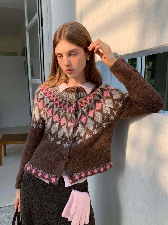 EGGKA覆古费尔岛提花咖色圆领毛针织开衫女秋冬覆古气质外套上衣