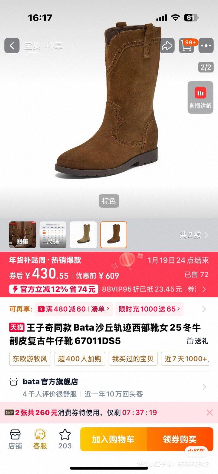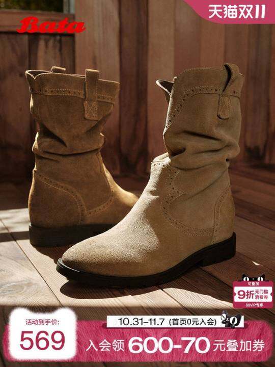 王子奇同款Bata沙丘轨迹西部靴女25冬牛剖皮复古牛仔靴67011DS5