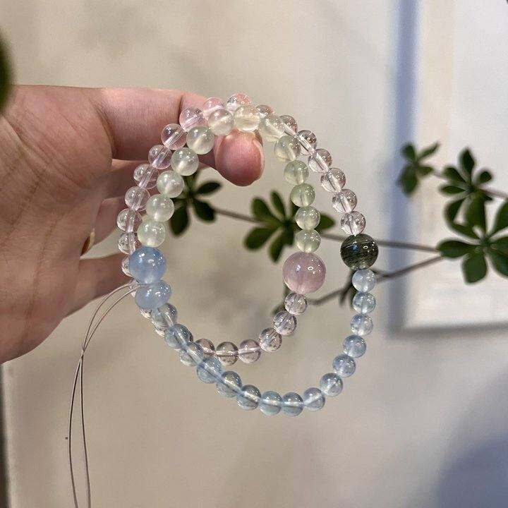 木水火天然海蓝宝粉水晶葡萄石双圈手串手炼五行喜水木火红玛瑙