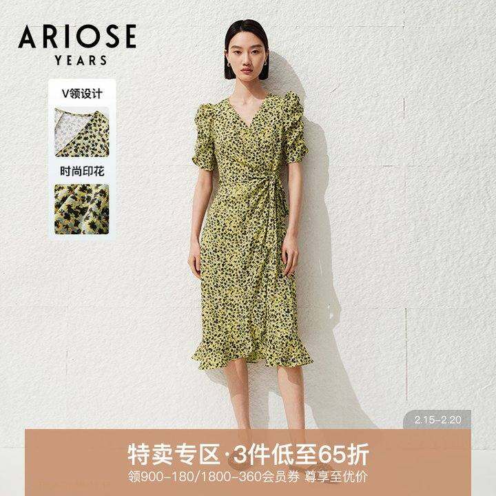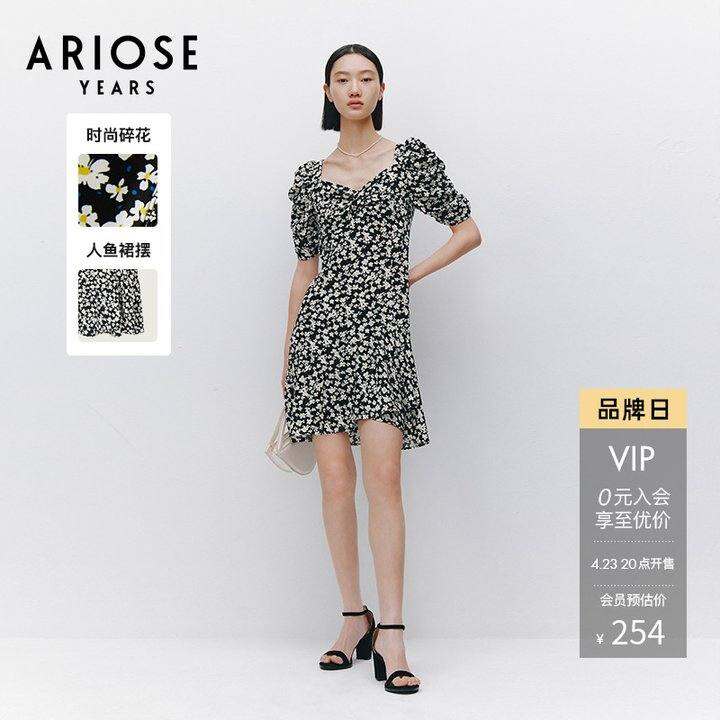 艾诺丝雅诗夏季新款黑色碎花连衣裙女人鱼裙摆法式收腰短款雪纺裙