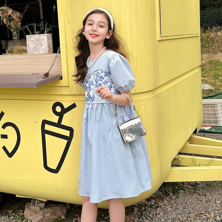 贝蒂2024夏季新款女童洋气泡泡袖连衣裙儿童中大童过膝短袖长裙子