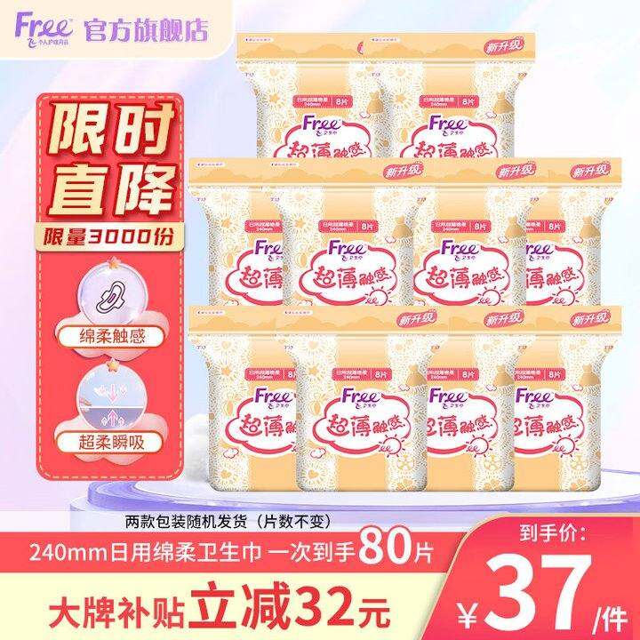FREE飞卫生巾日用超薄棉柔触感超柔瞬吸大姨妈巾学生少女M巾整箱批发 日用240mm*80片