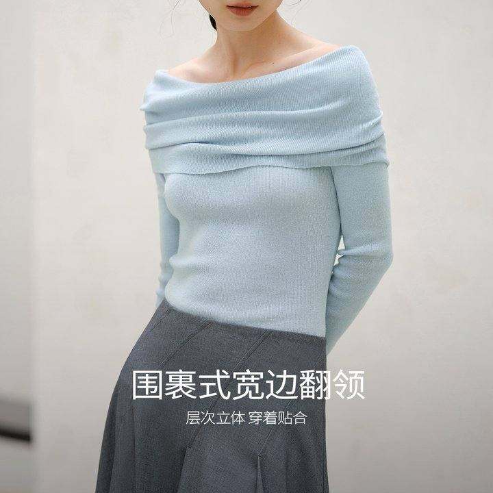 亦谷羊毛一字肩上衣针织衫女装秋冬2024年新款白色显瘦内搭打底衫