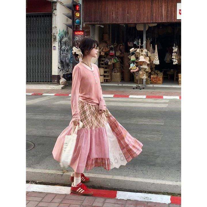 浮生八记“流浪诗人”复古浪漫感长裙全棉拼接蕾丝格纹半身裙