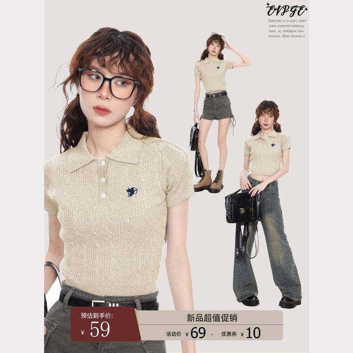 polo领短款针织短袖t恤女夏季学院风修身紧身设计感小众正肩上衣