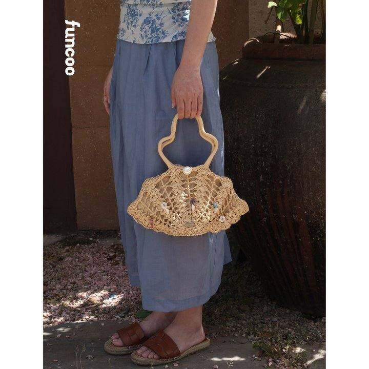 FUNCOO夏季贝壳镂空法式海边度假天然石手拎设计感小众草编包